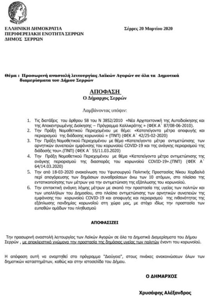 Αναστολή λειτουργίας Λαϊκών Αγορών σε όλα τα Δημοτικά Διαμερίσματα του Δήμου Σερρών
